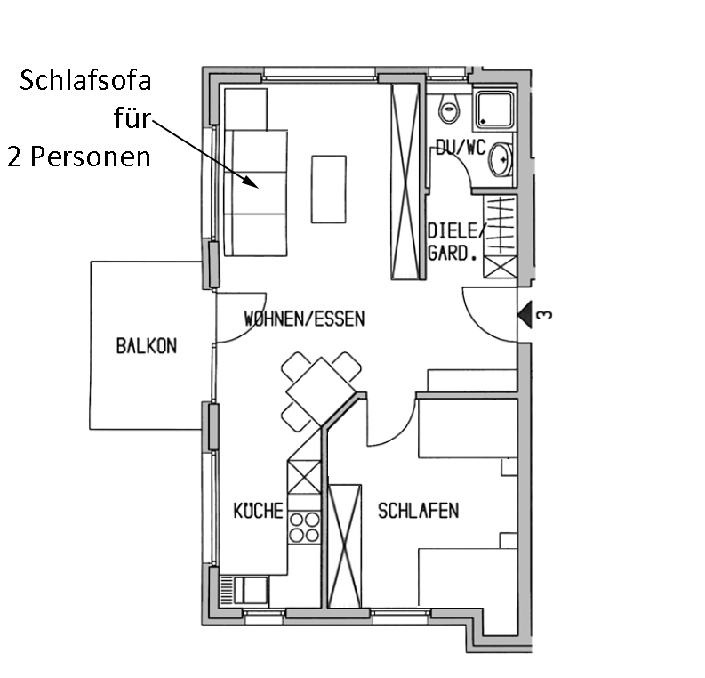 | Sonstige Informationen | Beim Zimmer 2 handelt es sich um das Wohnzimmer, dieses ist mit einem Schlafsofe für 2 Personen ausgestattet. Im Schlafzimmer befinden sich 1 Etagenbett und 1 Einzelbett. |